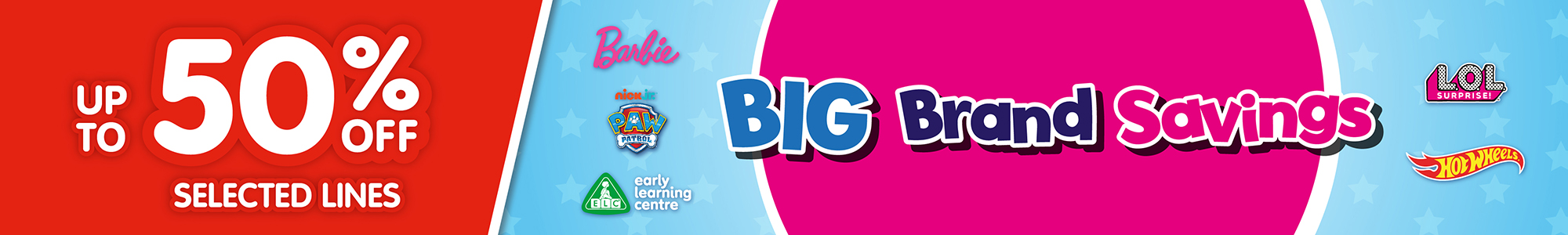 Shop big savings on some of the biggest brands including fashion dolls and accessories from Barbie and LOL Surprise!, classic collectible Hot Wheels cars and beloved learning toys from Early Learning Centre. Explore the great outdoors with Nerf or discover figures of all their favourite characters including Spider-Man, Paw Patrol, Peppa Pig and Gabby’s Dollhouse.